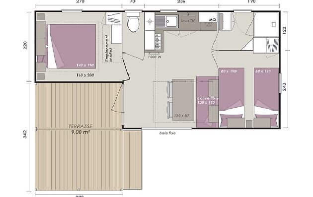 - Equipped kitchenette, hob, fridge-freezer, microwave,